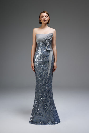 يُجسّد فستان "سيلفر ويف" ببراعة الضوء السائل، حيث يمزج انسيابية الترتر مع الأناقة النحتية. يتميز الفستان بتصميم بدون حمالات بدرجات اللونين الفضي والكحلي، مزين بالكامل بترتر عاكس يتموج كالماء تحت إضاءة خافتة. يتدفق قماش شبكي فضي معدني منظم من خط العنق، متدفقًا على طول الصدر في موجات طبيعية، مُحاكيًا حركة الضوء عبر الطيف. يتميز الفستان بعصريته وخلوده، ليُجسّد قوةً وانعكاسًا.