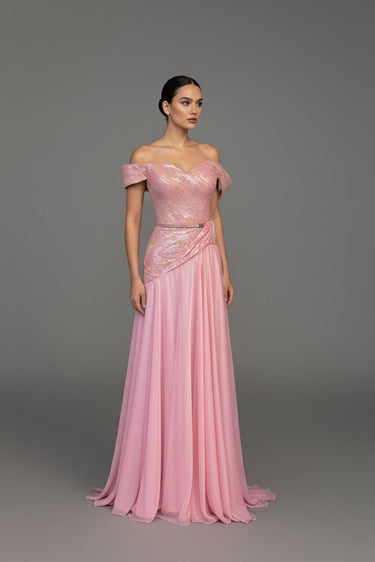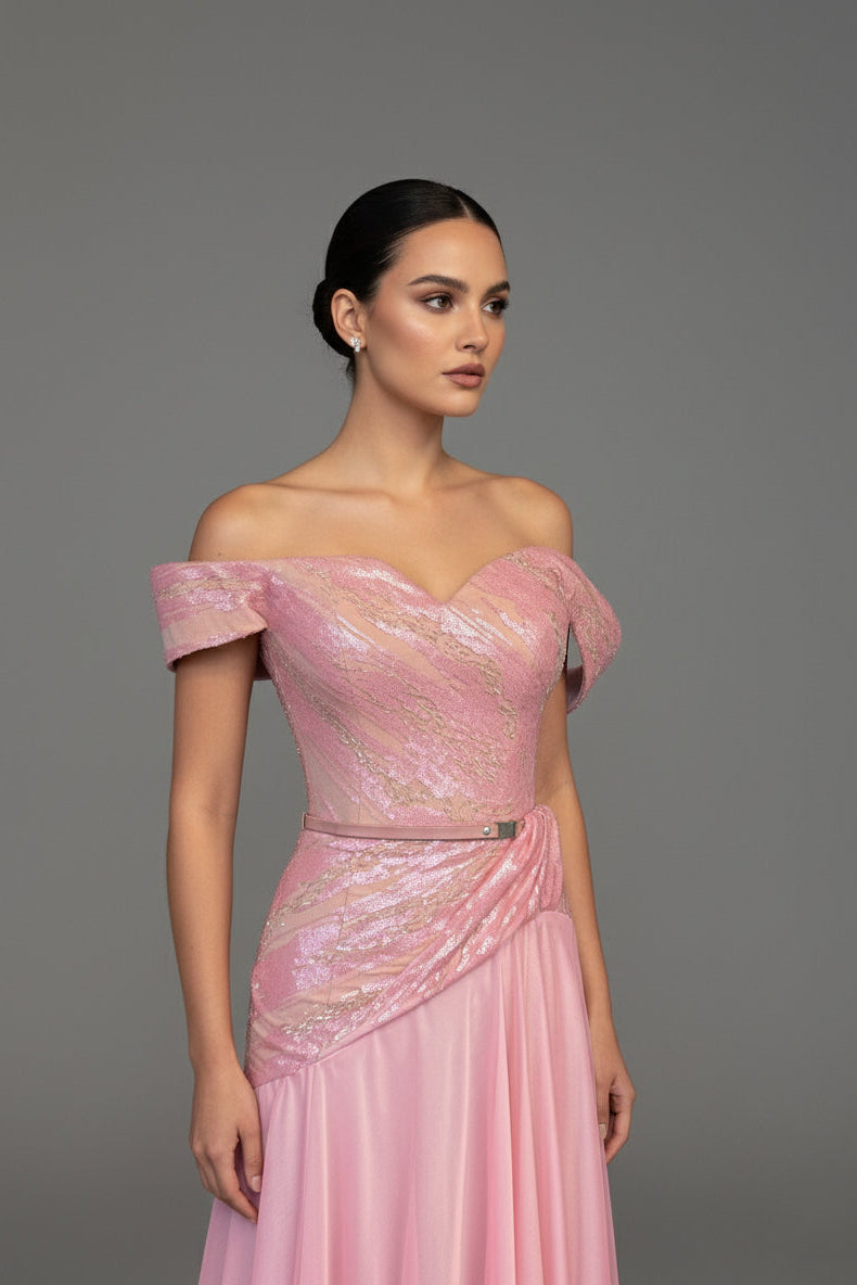 A graceful evening gown crafted in soft blush pink chiffon and shimmering lace. The off-shoulder neckline frames the collarbones beautifully, while the fitted bodice features delicate metallic threadwork that adds a subtle glow. A slender belt accentuates the waist, leading into a fluid draped skirt that moves effortlessly with every step.