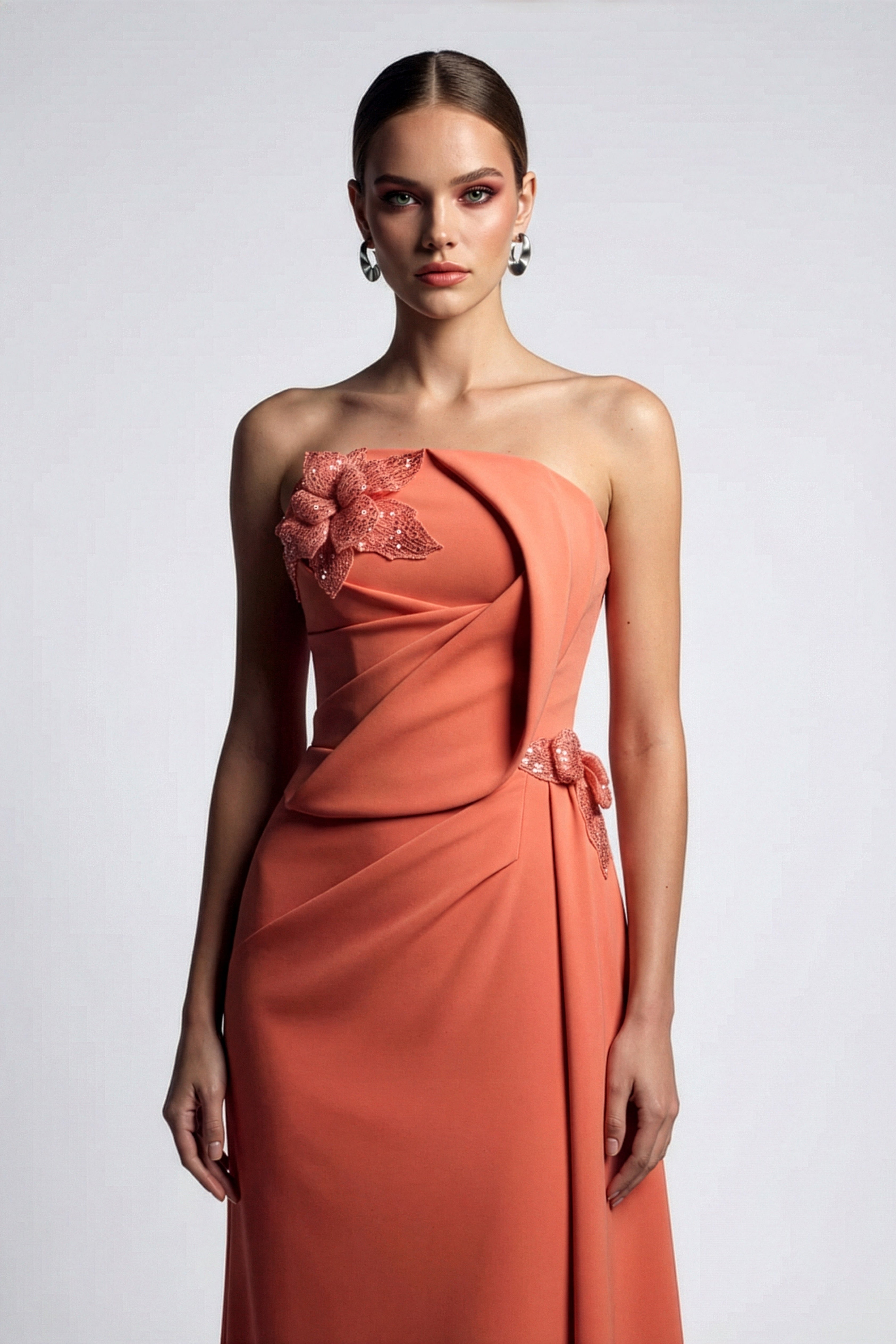 This strapless evening gown is crafted in a rich turquoise crepe with soft draping across the bodice and waist. Sequined floral appliqués at the neckline and hip add sparkle and dimension. The fitted bodice flows into a floor-length skirt with a subtle train at the back.