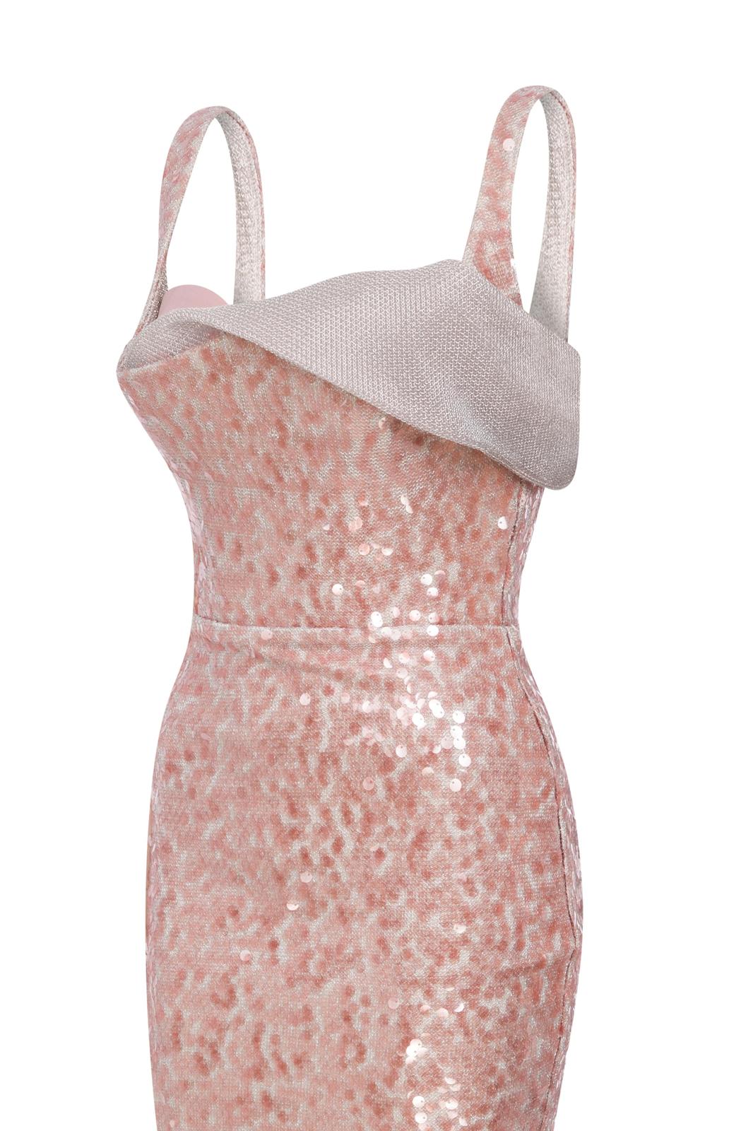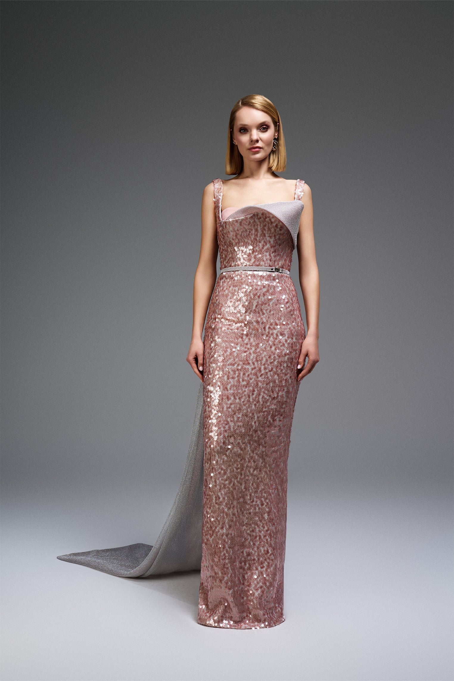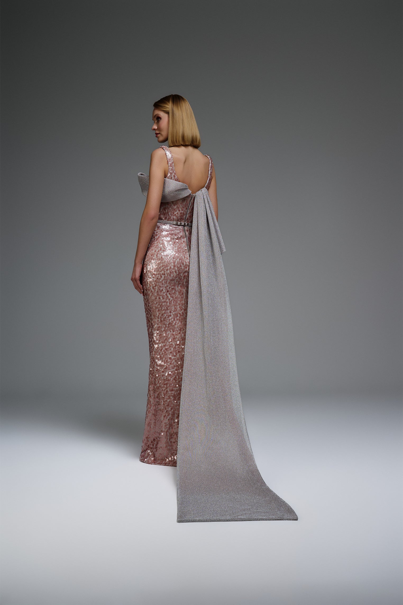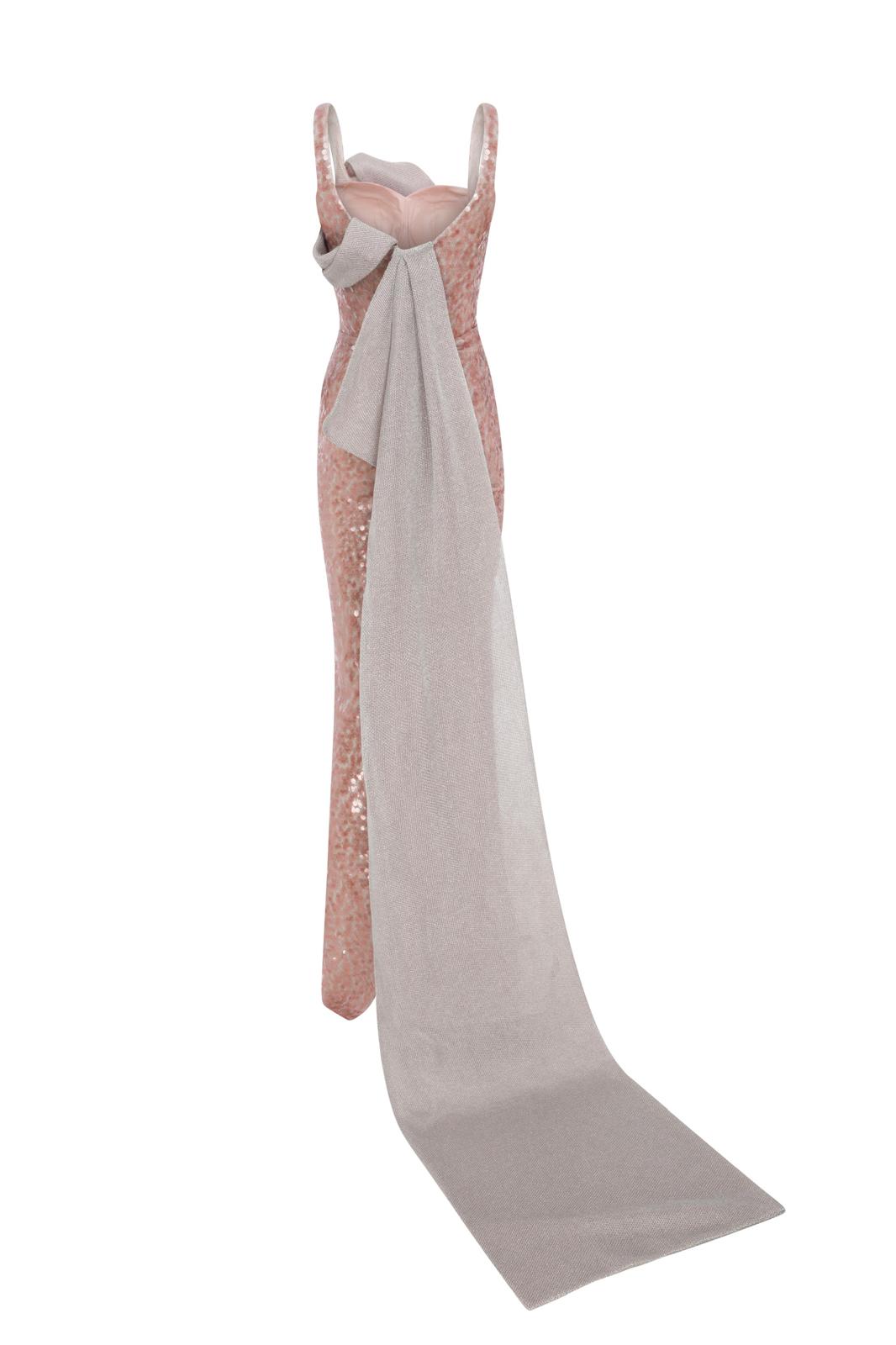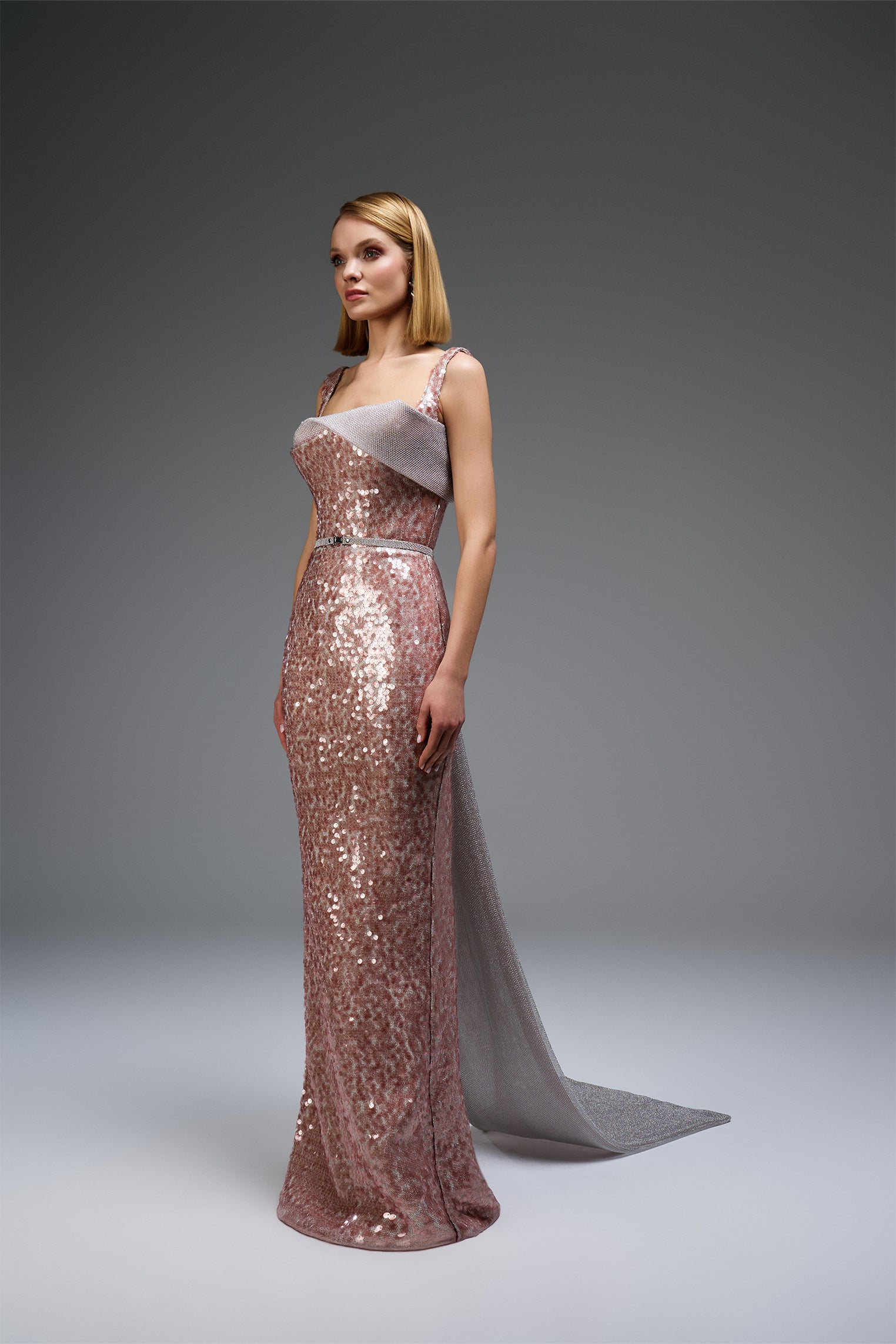 Embodies the dialogue between warmth and light — where rose hues meet silver tones in perfect balance. Crafted from blush sequin-embroidered tulle, it features a structured neckline accentuated with a Silver Mesh overlay that adds a futuristic glimmer. The sleek silhouette flows into a soft train, creating a harmonious play of reflection and contrast — a signature of the Spectrum’s radiant aesthetic.