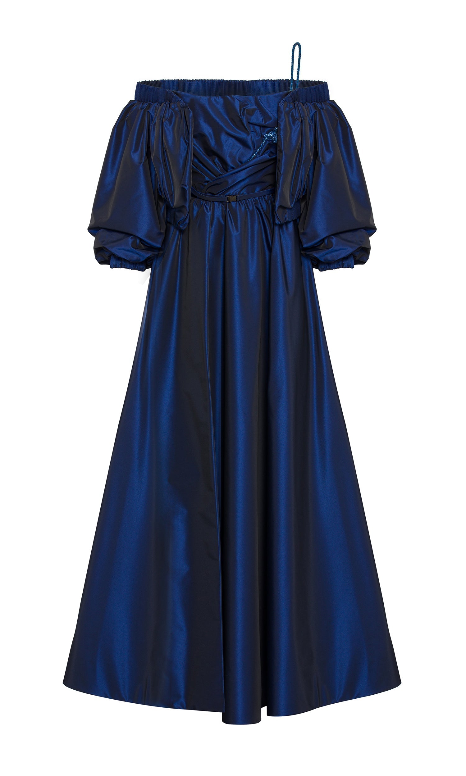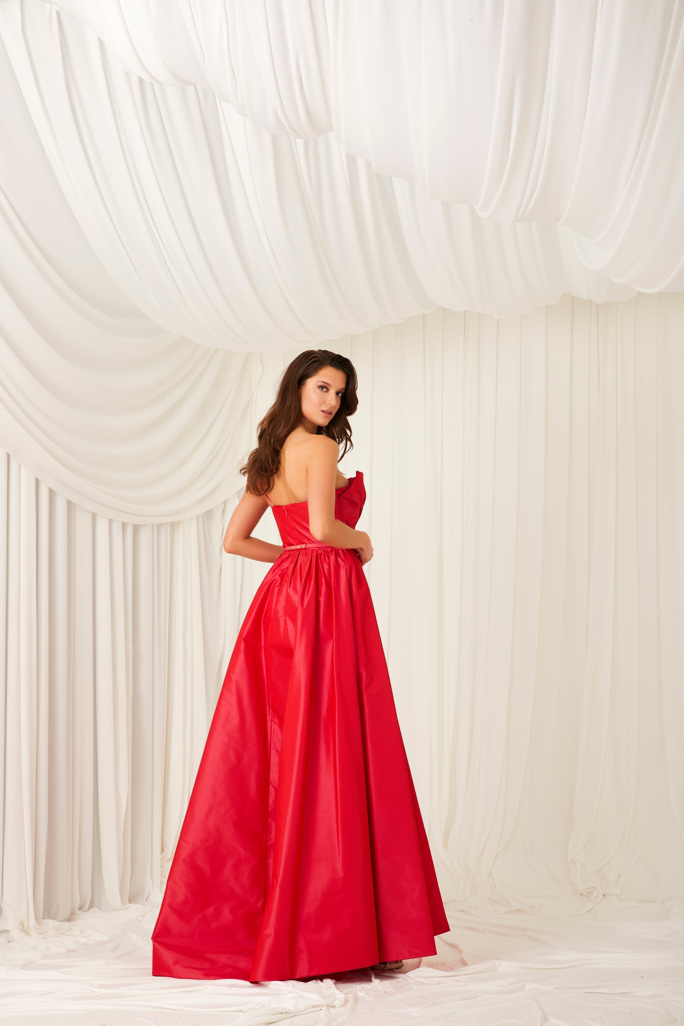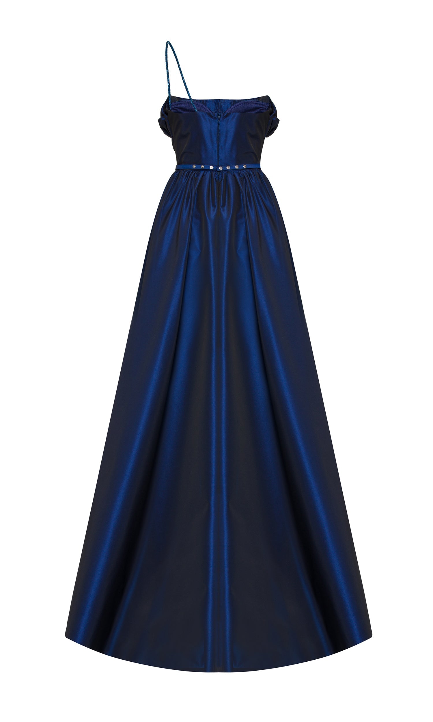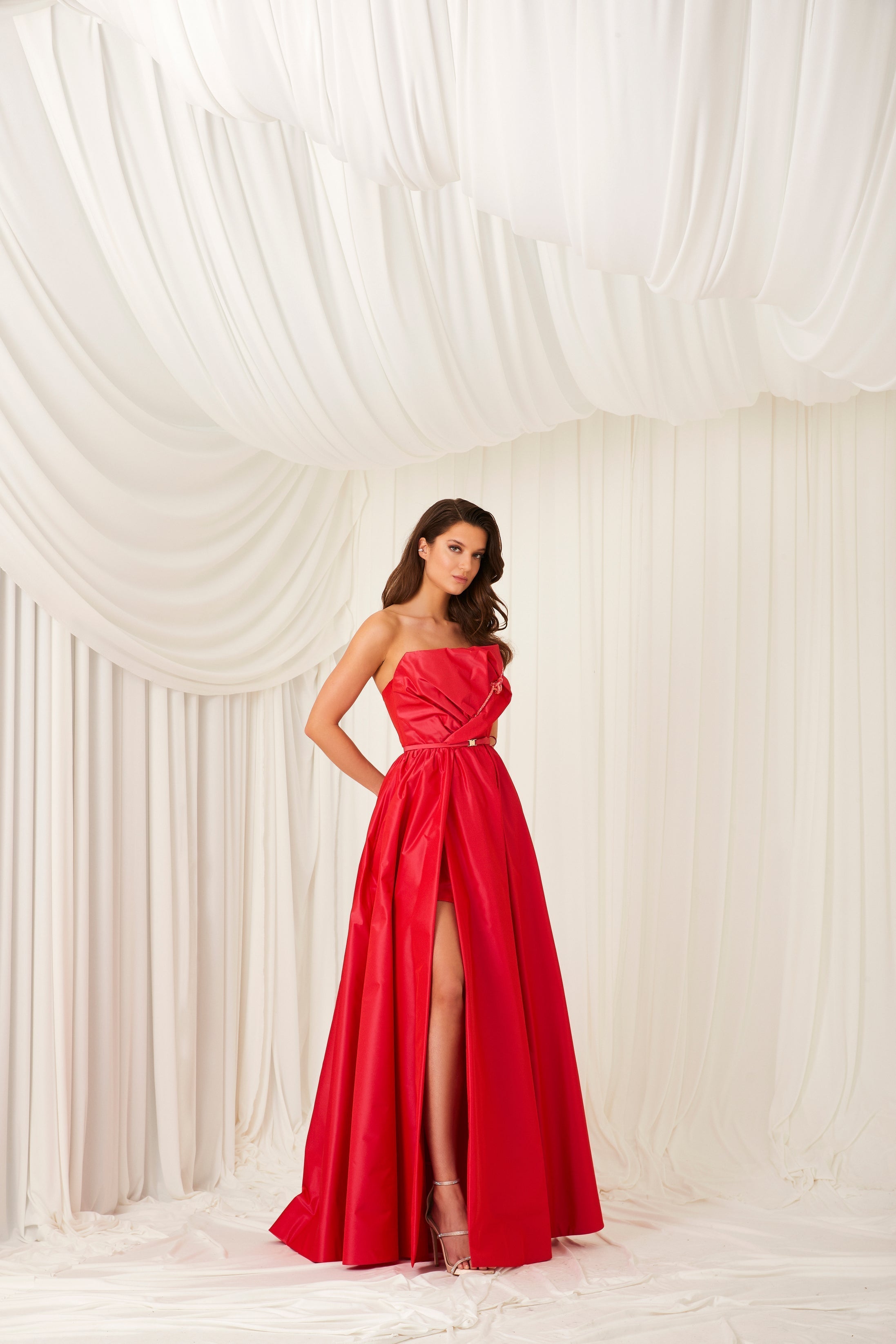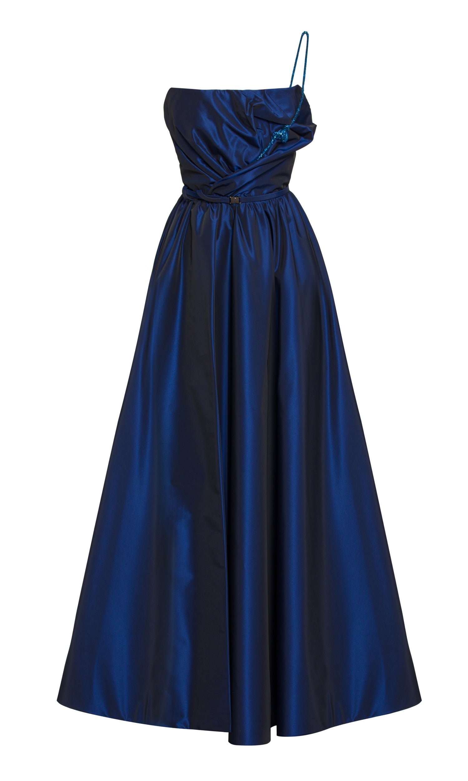 Strapless tafta dress with draped bust & embellished strap.