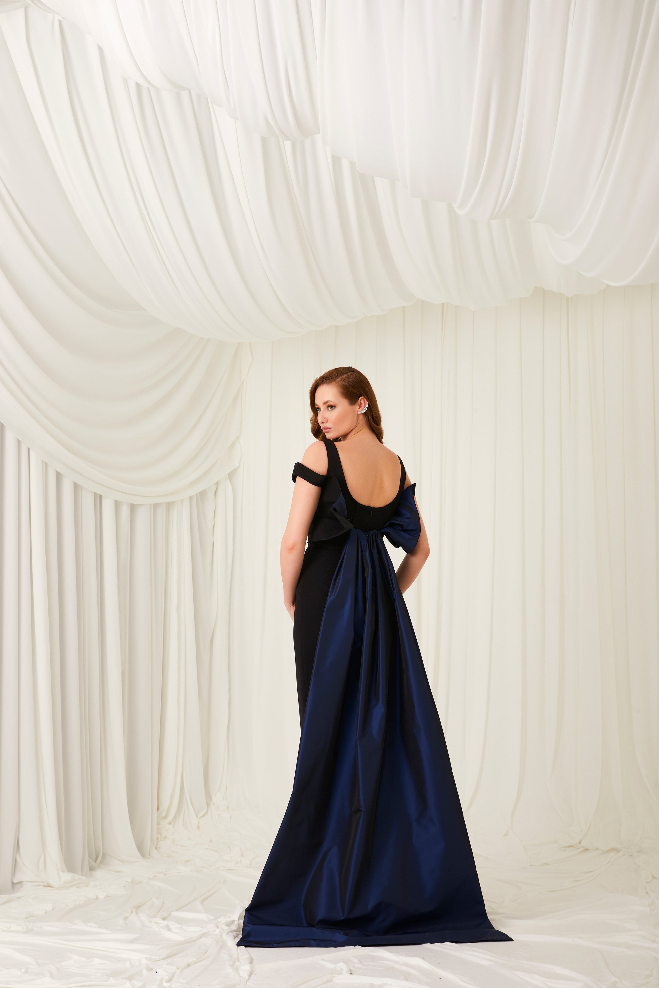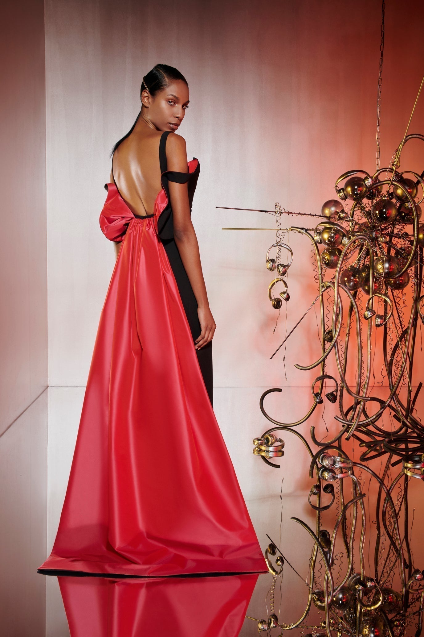Black crepe dress with superpositioned corsets, which comes with a neon coral back side changing tafta train and a heart-shaped tulle