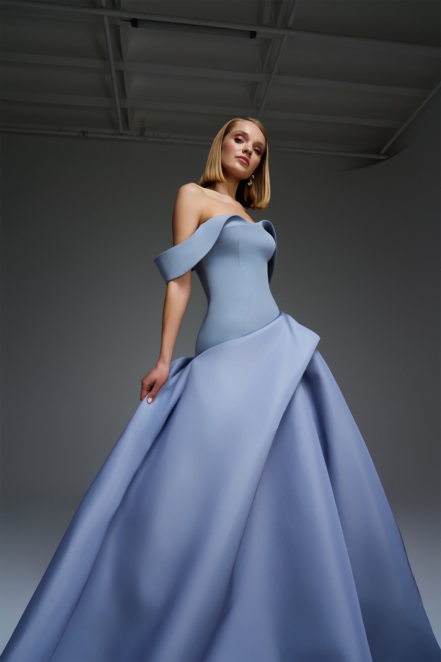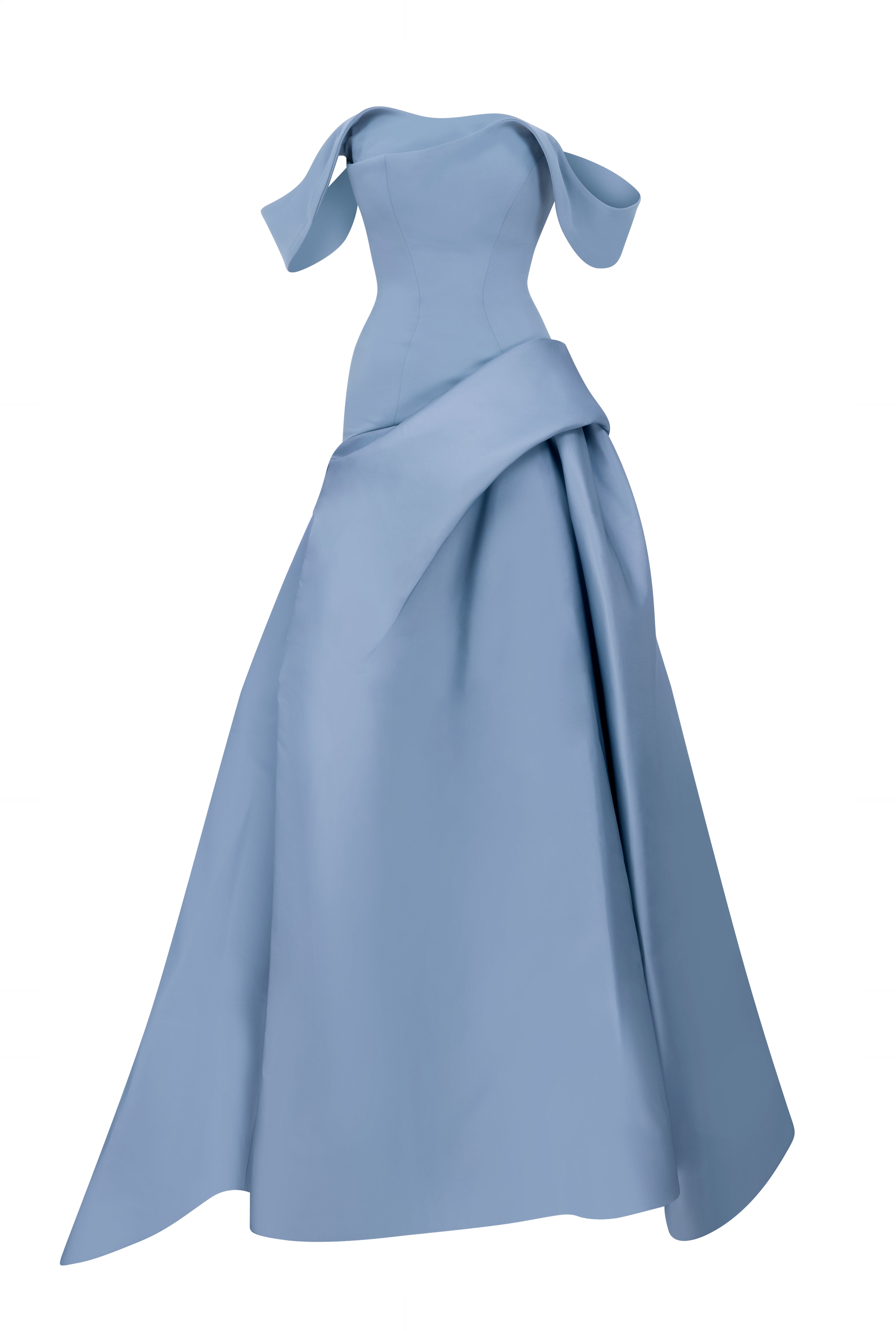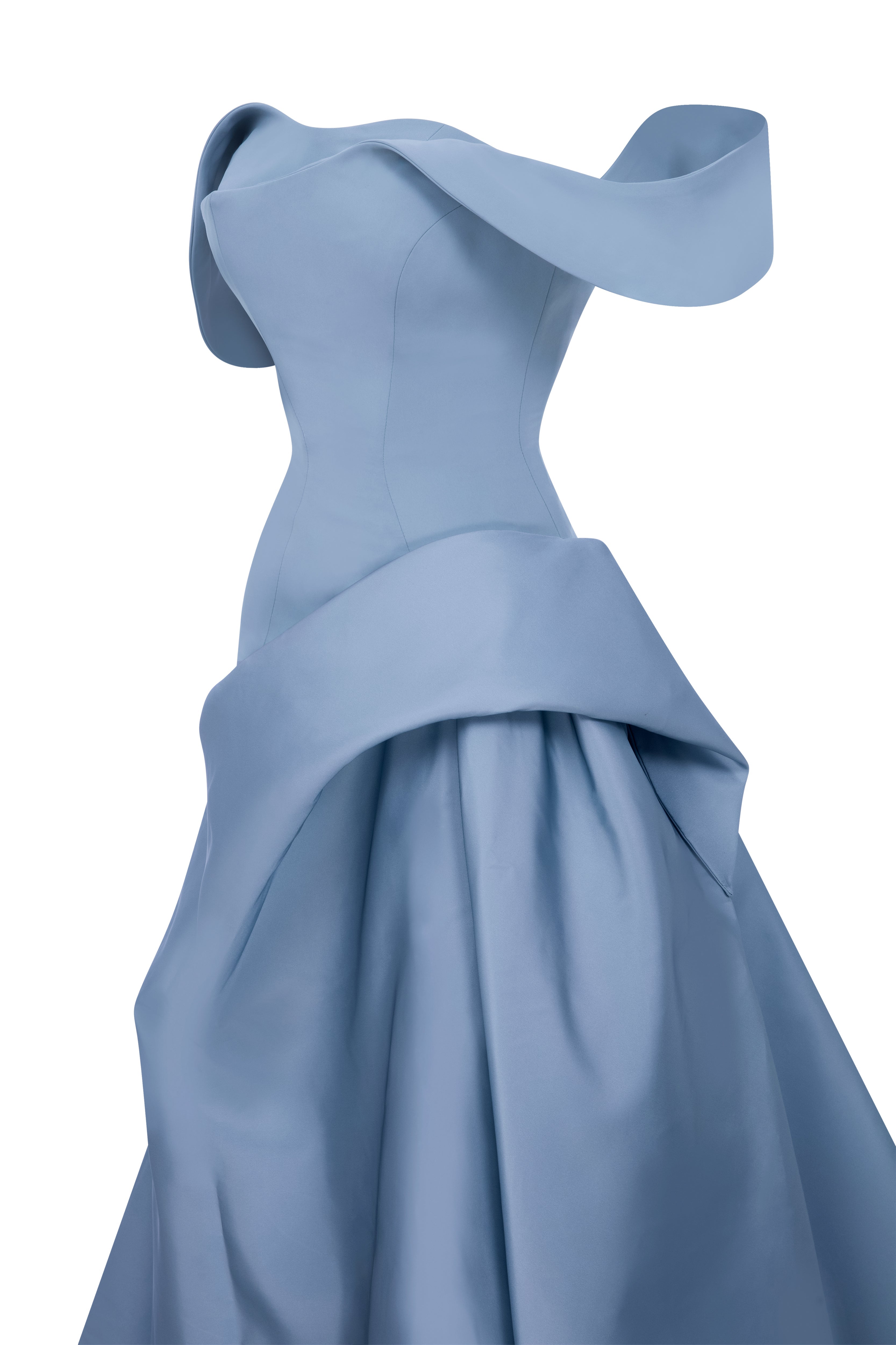• A sculptural gown that embodies the quiet power of simplicity. Crafted from a refined blend of crepe and taffeta in a serene shade of misty blue, the gown reflects light like calm water. The off-shoulder neckline flows into a sleek crepe bodice, while the voluminous taffeta skirt unfolds in an architectural drape — creating a balance between structure and softness. A piece that captures stillness and movement within the Spectrum.
