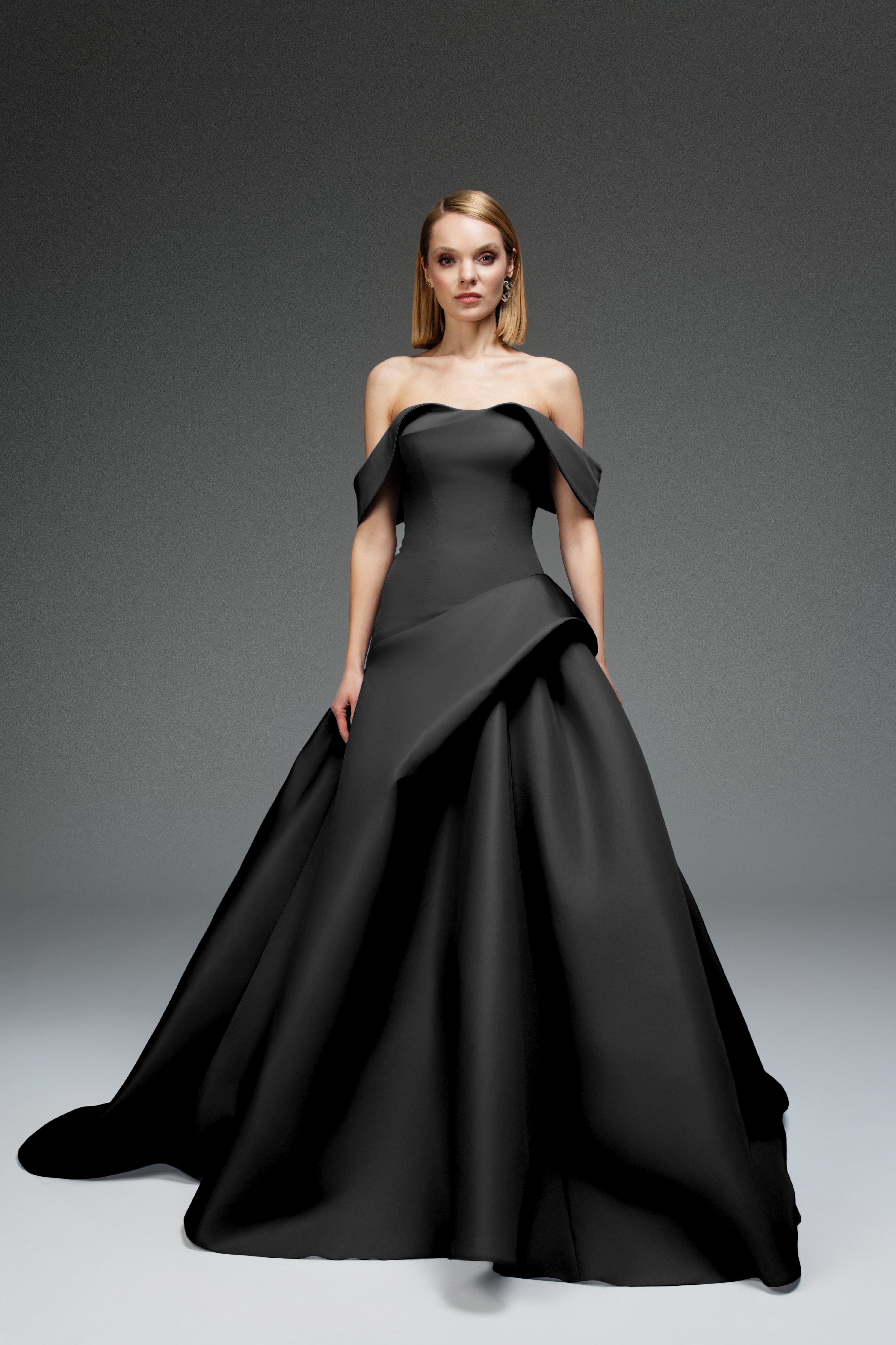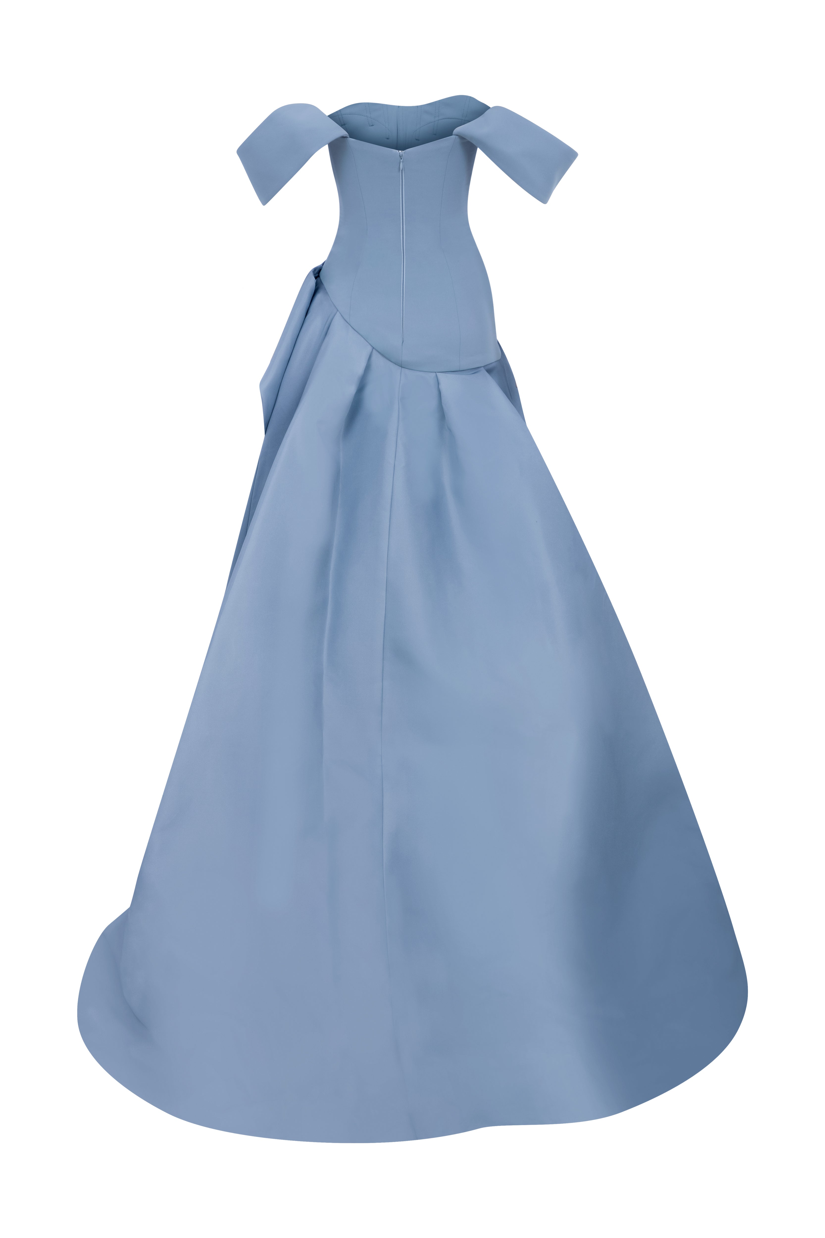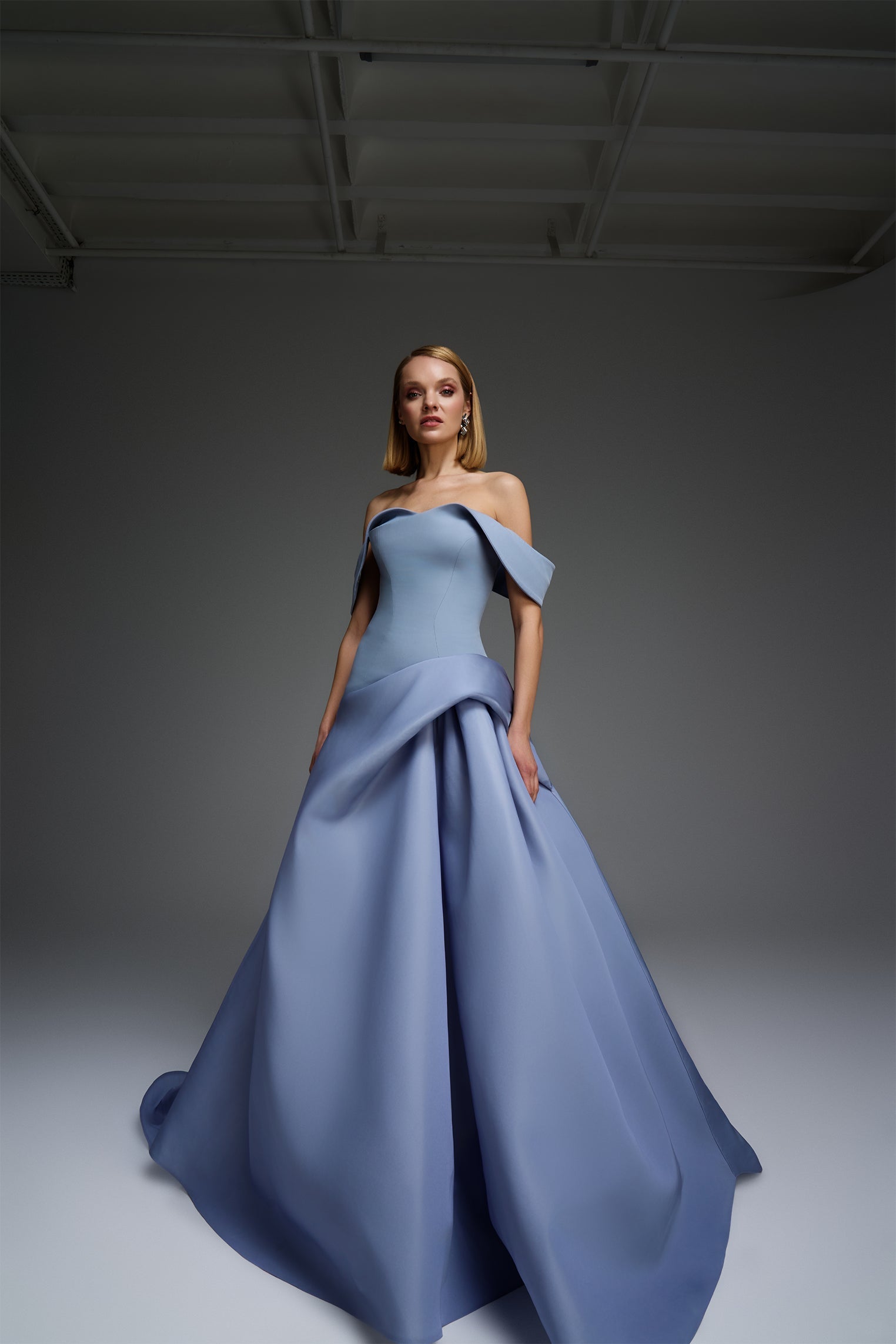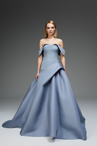 • A sculptural gown that embodies the quiet power of simplicity. Crafted from a refined blend of crepe and taffeta in a serene shade of misty blue, the gown reflects light like calm water. The off-shoulder neckline flows into a sleek crepe bodice, while the voluminous taffeta skirt unfolds in an architectural drape — creating a balance between structure and softness. A piece that captures stillness and movement within the Spectrum.