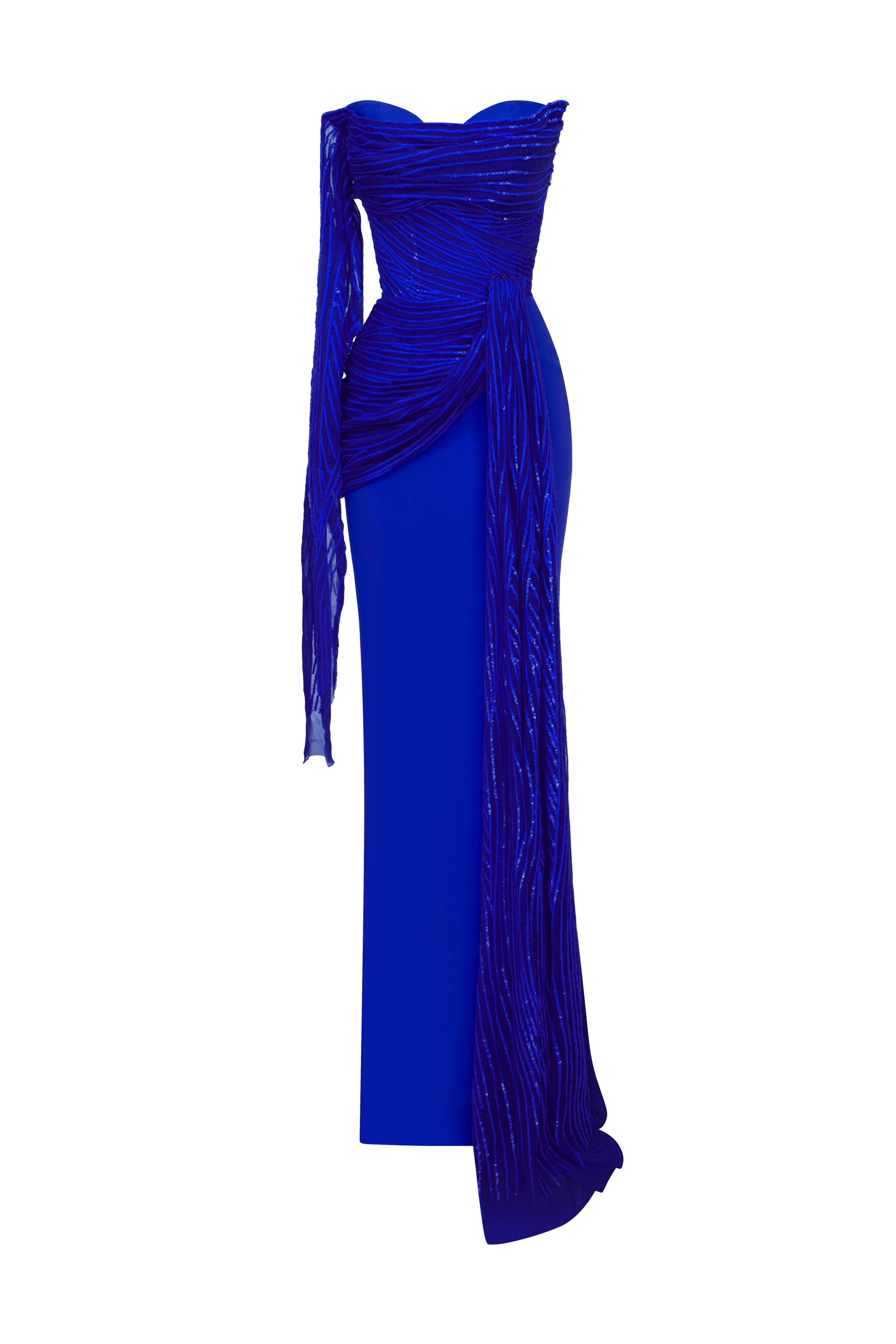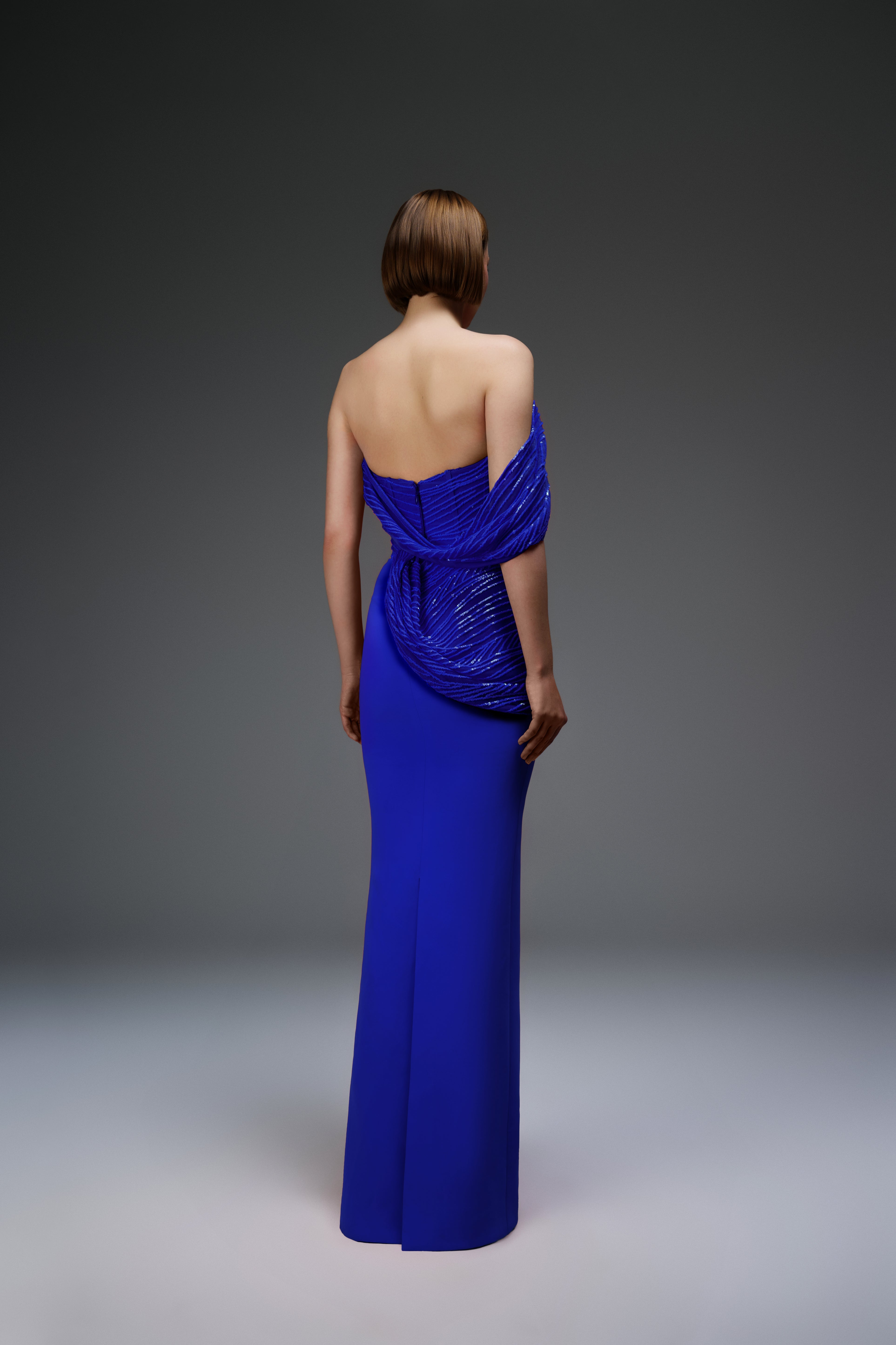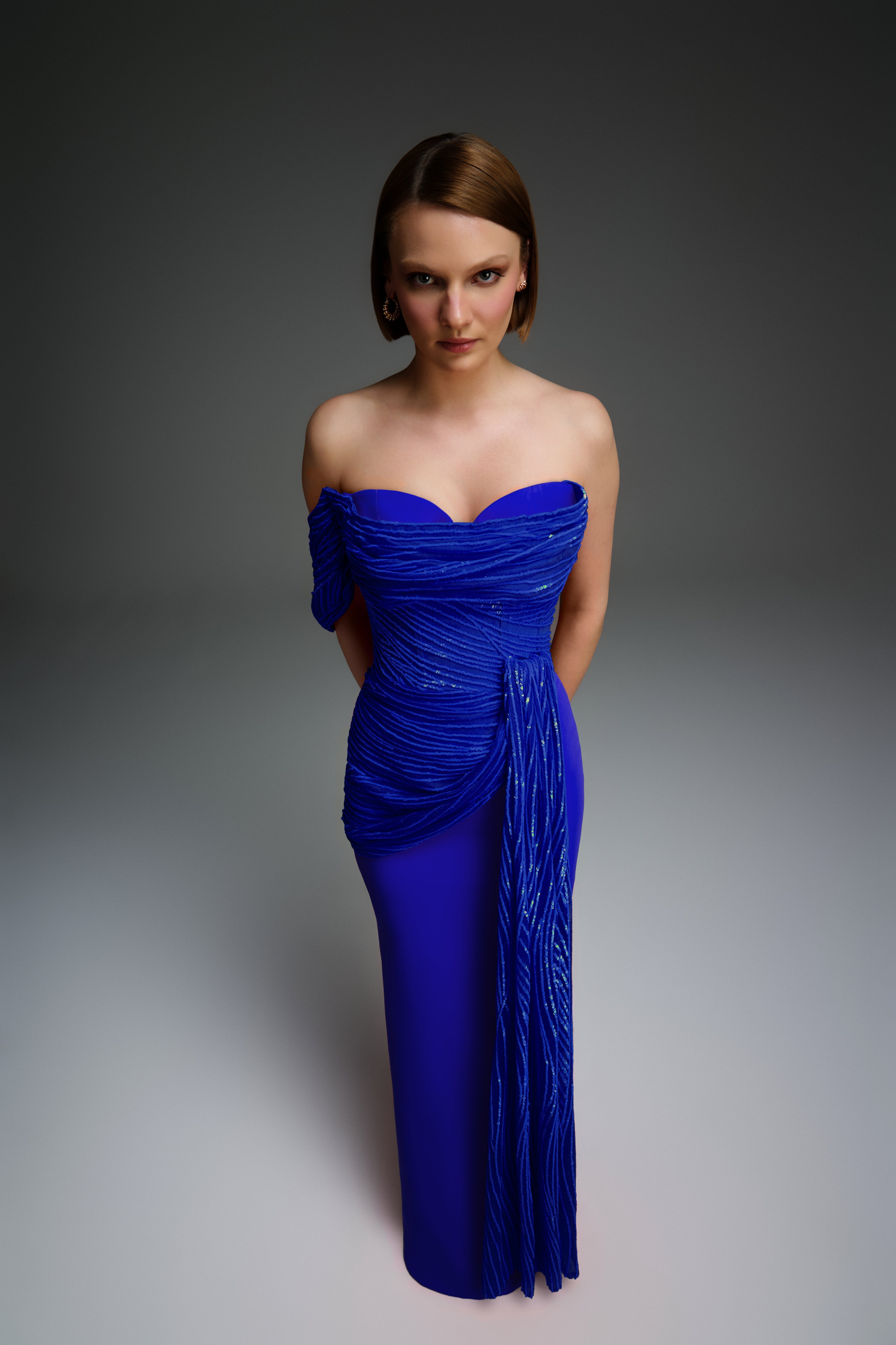 • A radiant expression of movement and light, the Coral Beam Gown captures the vivid energy of the Spectrum’s warmest tones. Designed in stretch crepe and layered with pleated sequin tulle, it sculpts the silhouette with luminous texture and fluid motion. The asymmetric draping flows from the neckline to the waist, reflecting light in every fold — a visual rhythm of confidence and modern grace.