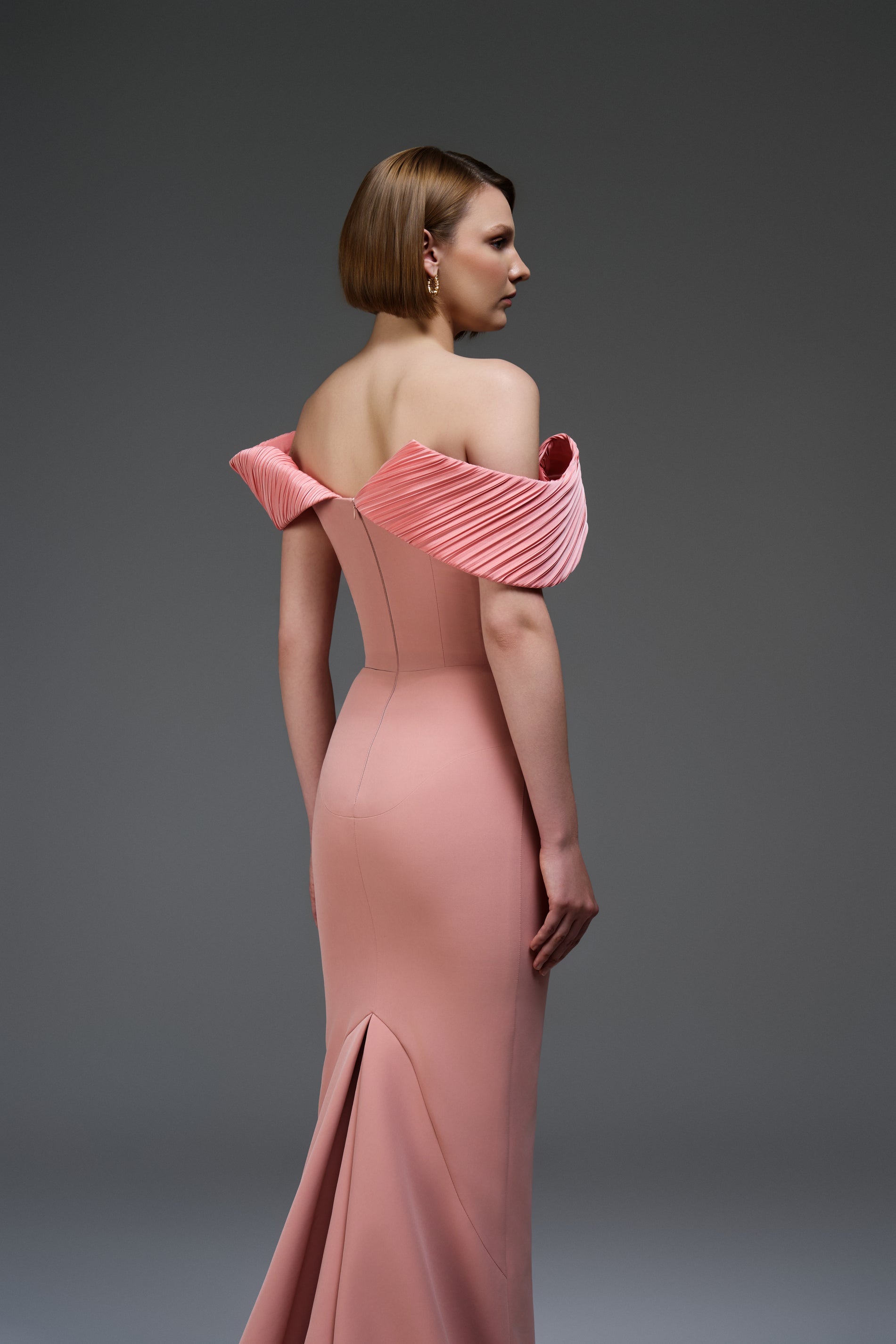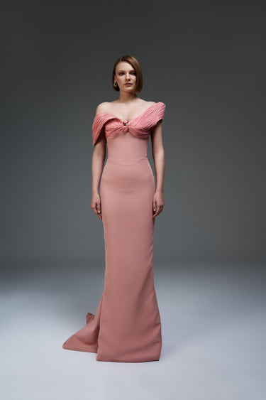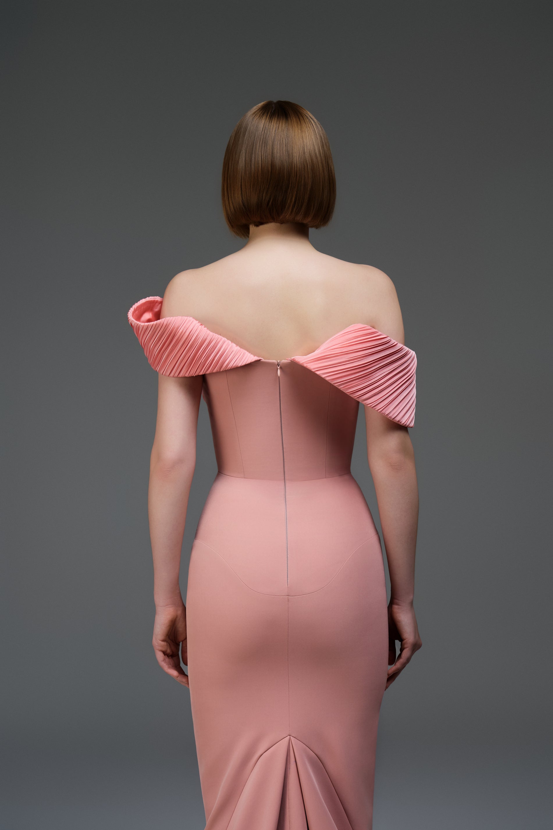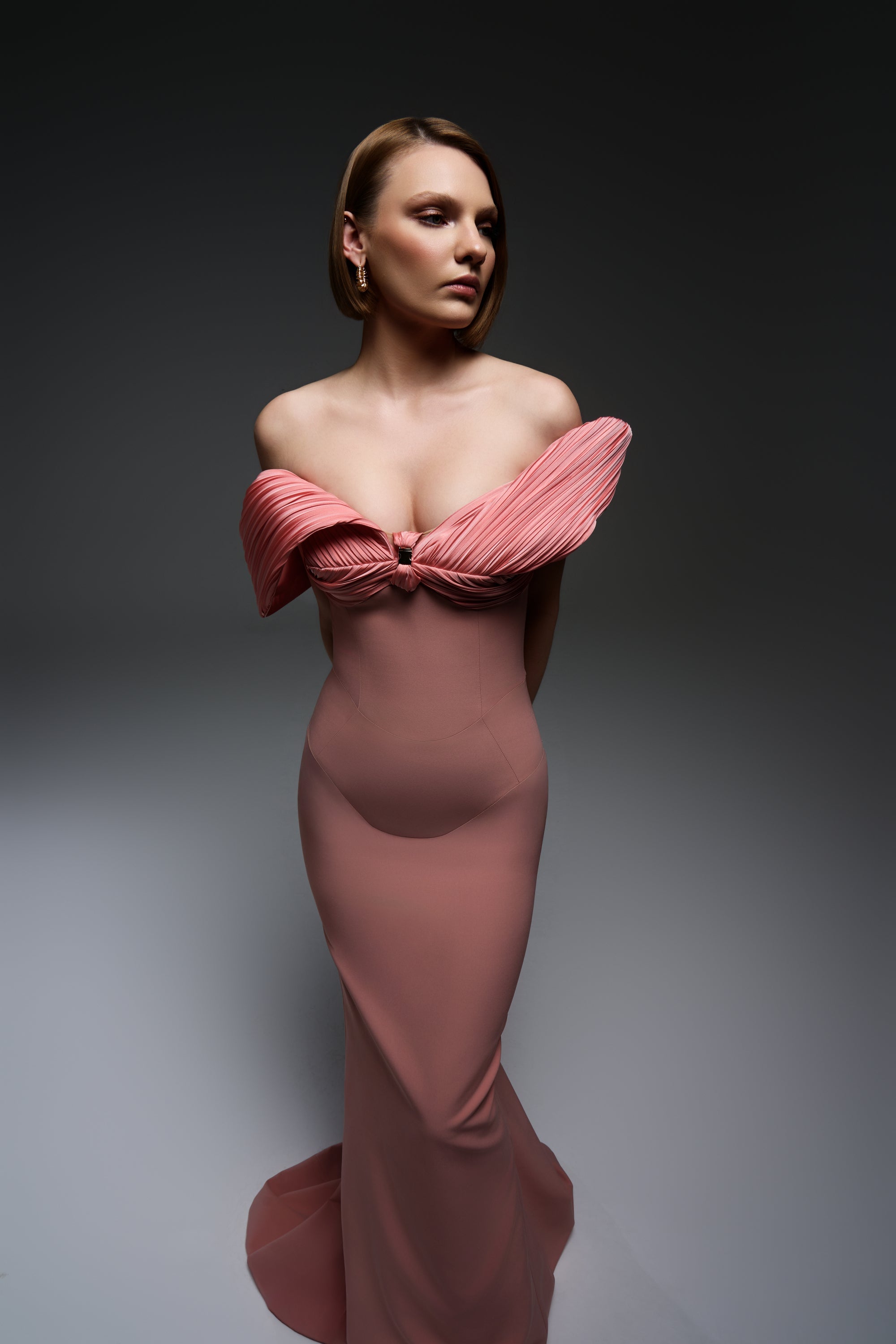 • Captures the essence of fluid architecture and refined femininity. Crafted from matte satin with tightly pleated detailing on the bust, the off-shoulder neckline wraps around the body and gathers at the center in a sculptural knot. The sleek crepe silhouette elongates the form, while the soft blush tone and textural contrast evoke the calm rhythm of light across the Spectrum — subtle, structured, and irresistibly elegant.