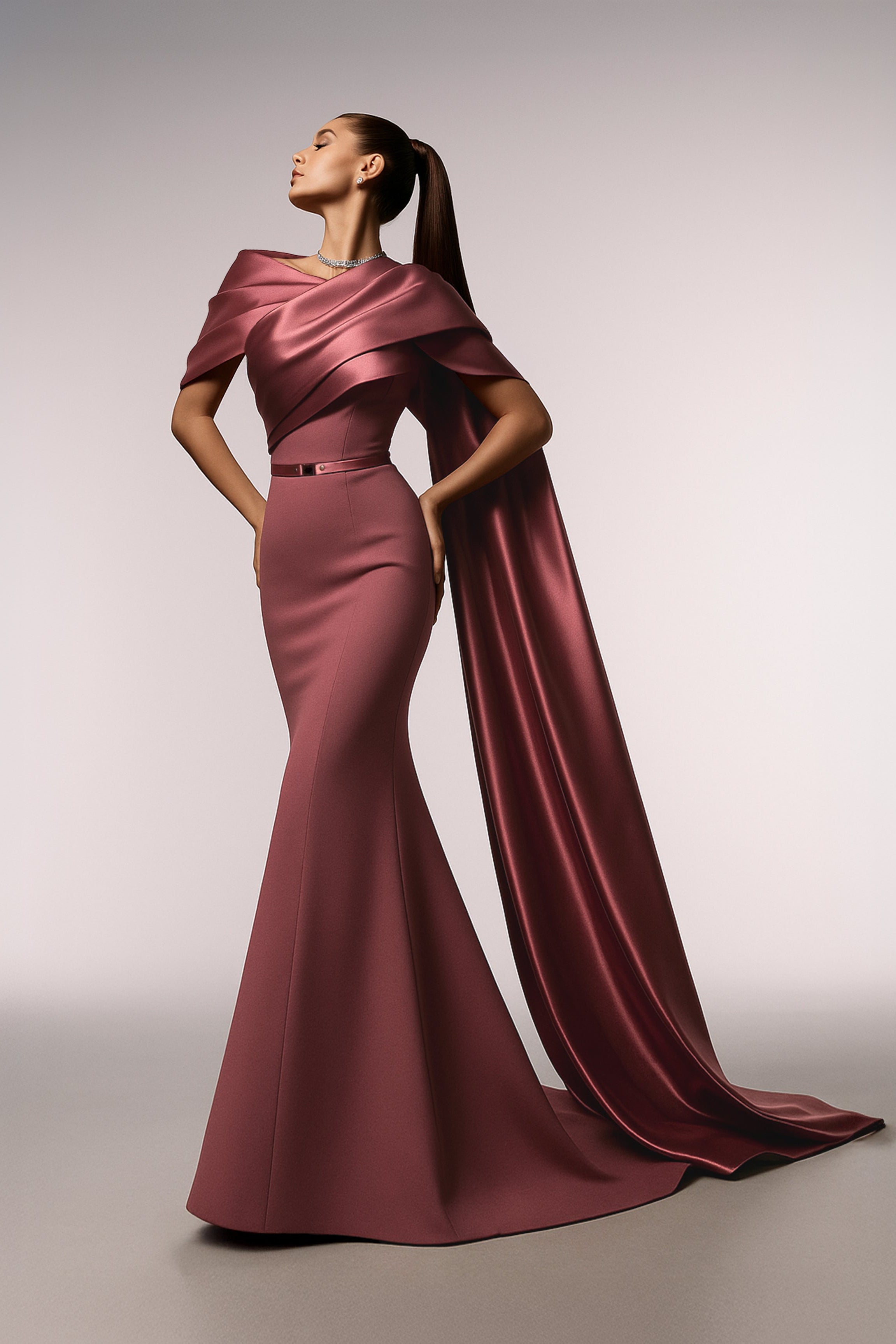 Its sculptural off-shoulder drape wraps around the bodice, extending into a long side train that cascades gracefully to the floor. The fitted waist and floor-length mermaid silhouette elongate the form, while the minimal belt detail adds subtle definition and balance.