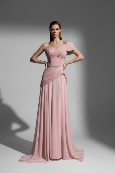 This rose-blush gown features a fitted, structured bodice with an off-shoulder pleated design. The waist includes a small belt detail that shapes the silhouette. The skirt is made from lightweight chiffon that falls smoothly to the floor for a clean, refined look