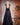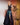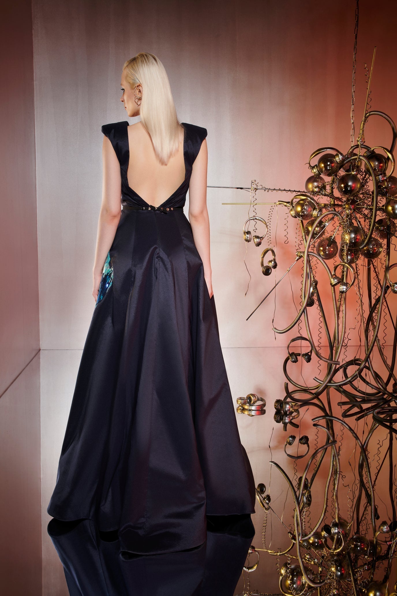 A-symmetrical navy-blue tafta dress embellished with heart-shaped embroidery on the skirt’s slits