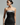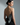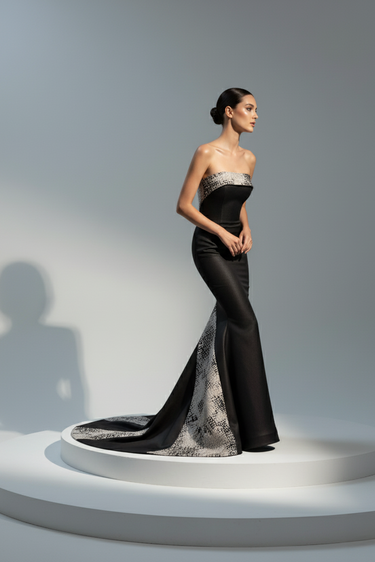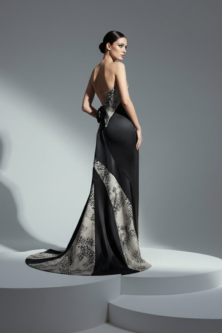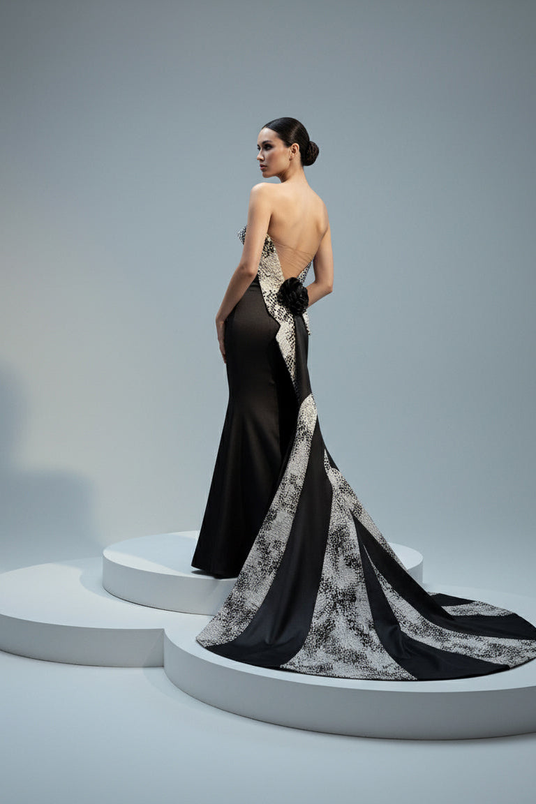 An emblem of refined glamour, this strapless gown by Li Beirut Design combines sleek architecture with fluid movement. Crafted in black satin with contrasting silver jacquard panels, the silhouette hugs the body before cascading into a dramatic train. The sculpted back reveals an elegant plunge, adorned with a hand-crafted satin flower accent.