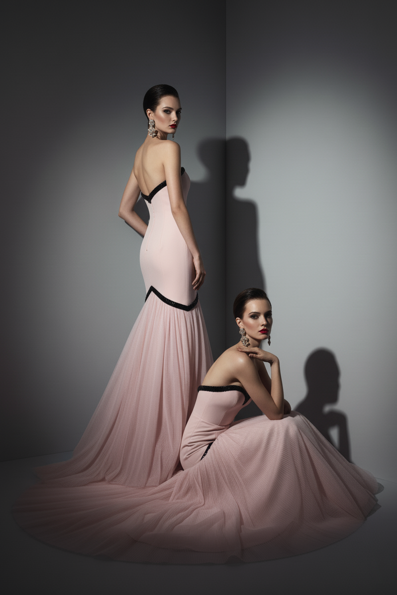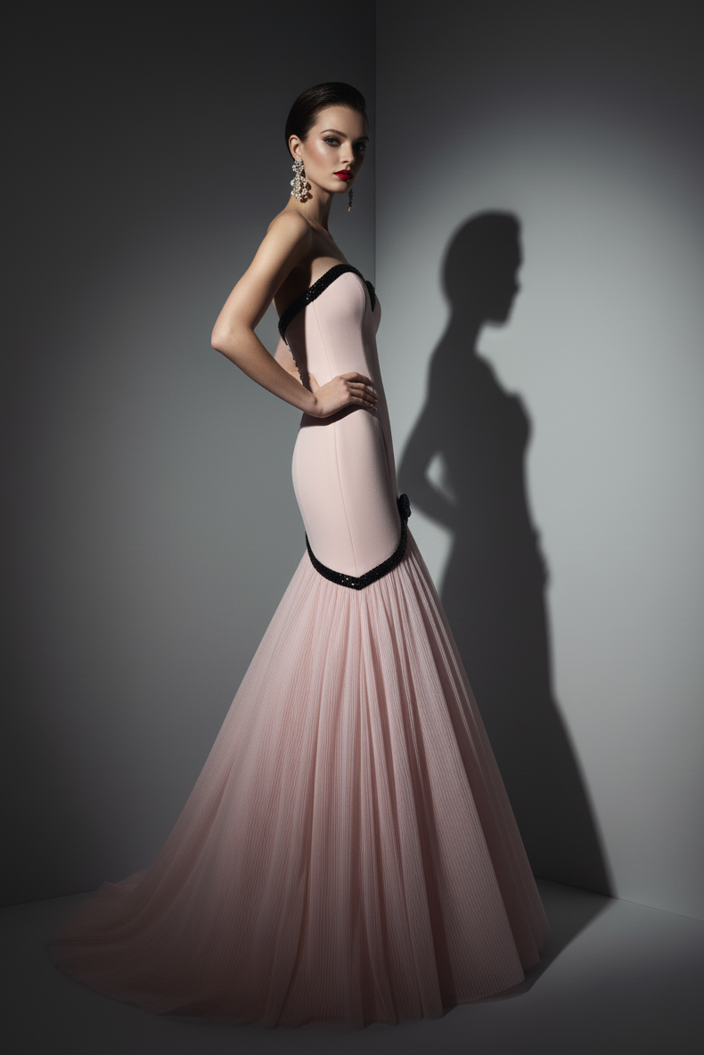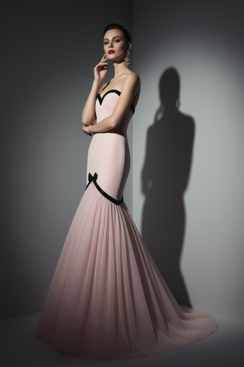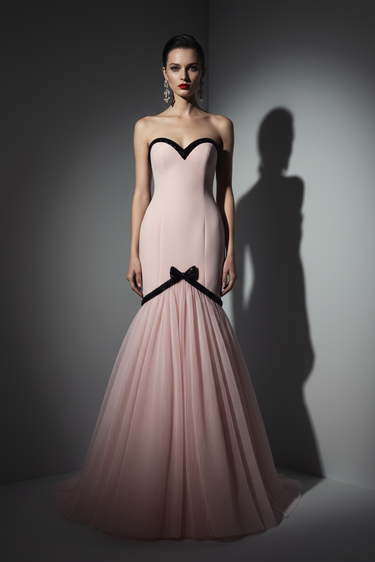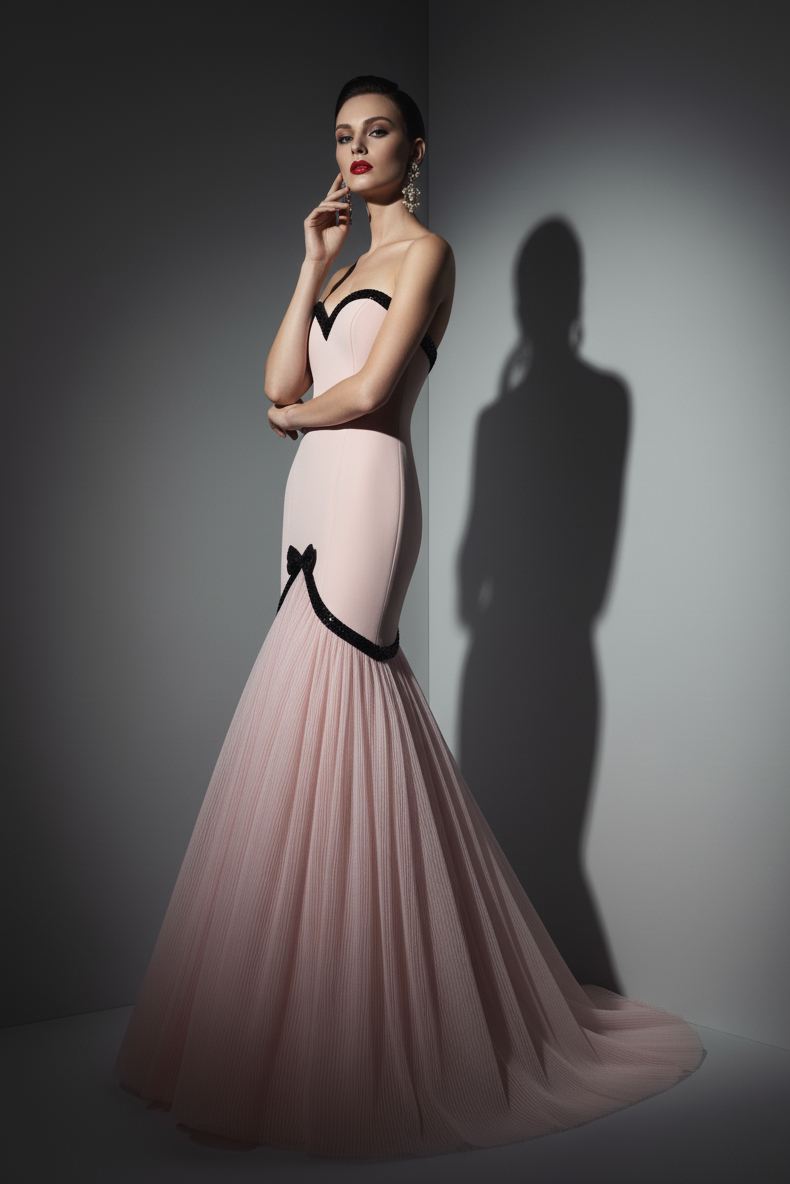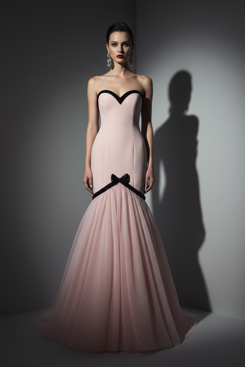 A striking fusion of grace and structure, this blush strapless gown redefines evening sophistication. The sculpted bodice, outlined with black beaded trim, enhances the neckline and contours the figure with architectural precision. A delicate bow accent marks the transition to the pleated tulle skirt, which flares into a sweeping mermaid silhouette.